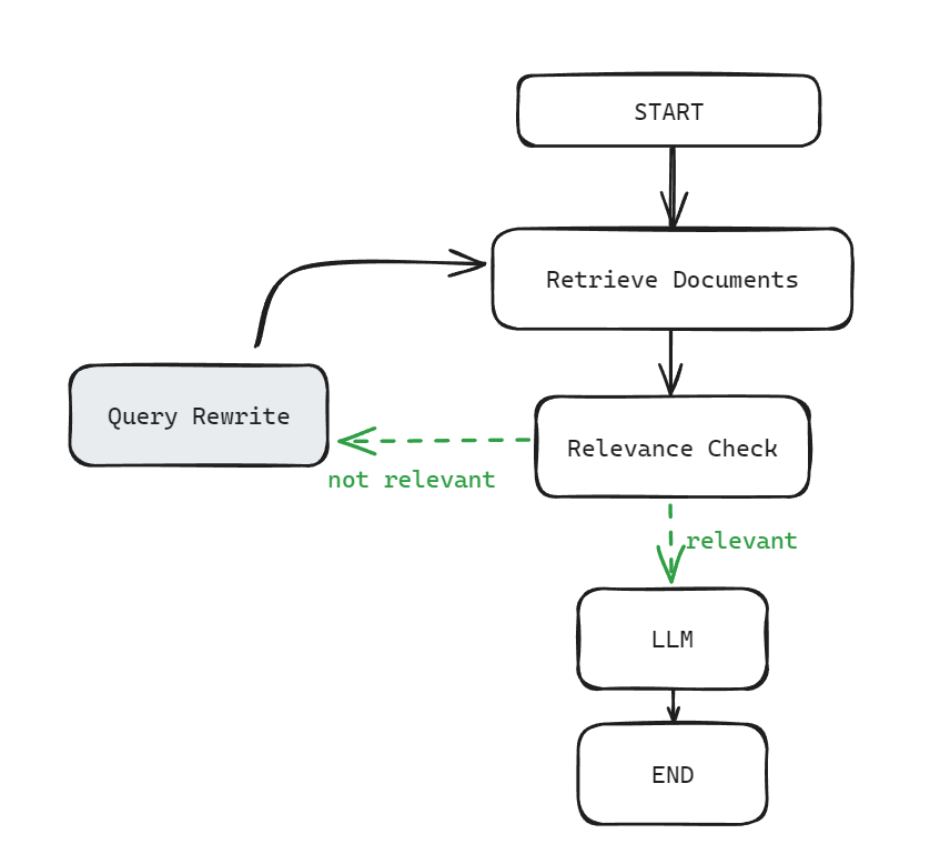 아래와 같은 그래프의 경우 에이전트를 사용하지 않은 RAG의 흐름이다. 아래 흐름에서는 우선 문서를 검색해서 가져온다. 그리고 문서의 연관성을 판단한 뒤, 만약 질문과 연관있는 문서가 retrieve되지 않았다면, 쿼리를 재작성하고 새로 작성된 쿼리로 문서를 가져온다.