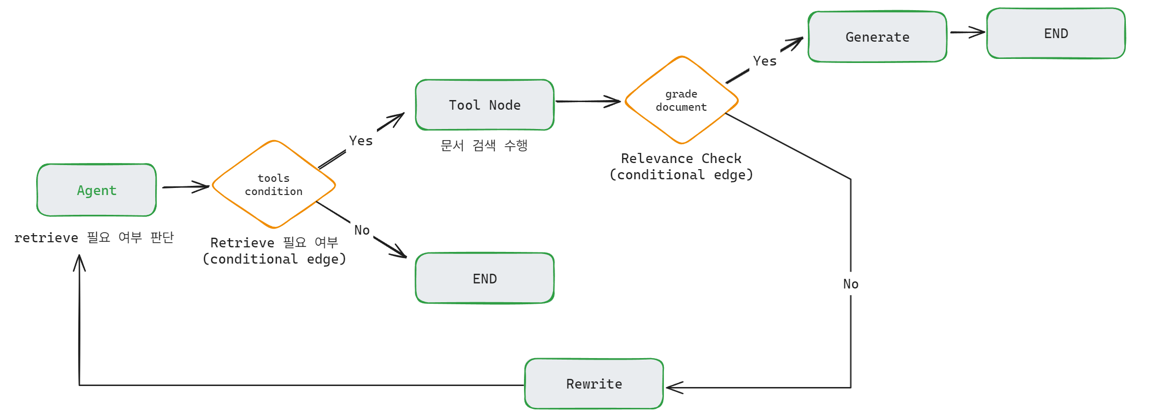 - 관련성이 없다면, 사용자 쿼리 재작성 후 1번으로 이동 (Agent node)