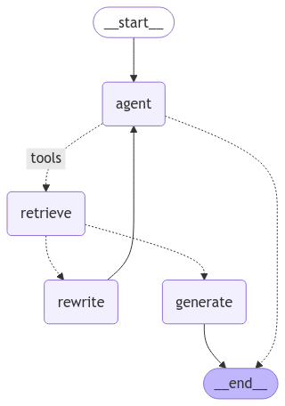 - agent → retrieve → rewrite → agent → retrieve → ... → generate