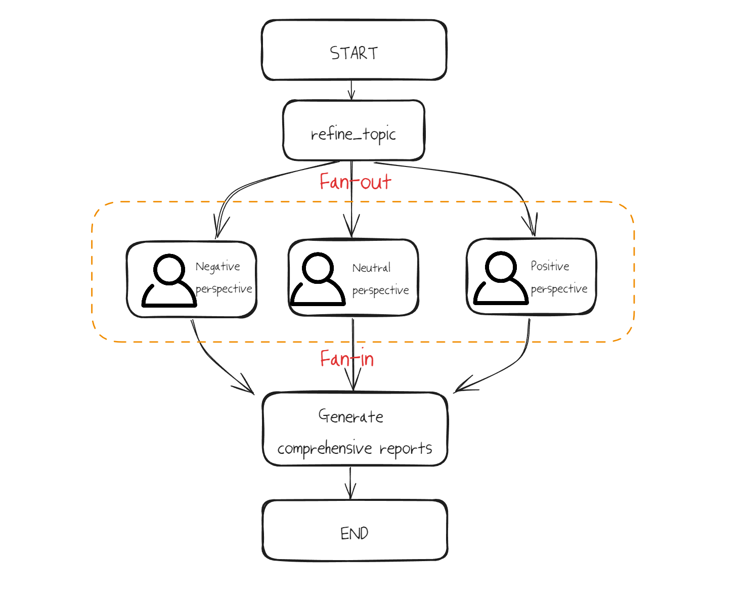 여기서 Fan-out은 병렬 처리를 위해 흩어지는 부분, Fan-in은 병렬 처리가 끝난 뒤 합쳐지는 구간을 말한다. 위 그림에서는 3개의 노드로 확장되는 부분인 fan-out, Generate_comprehensive_reports 노드로 합쳐지는 부분을 fan-in이라고 부른다.
