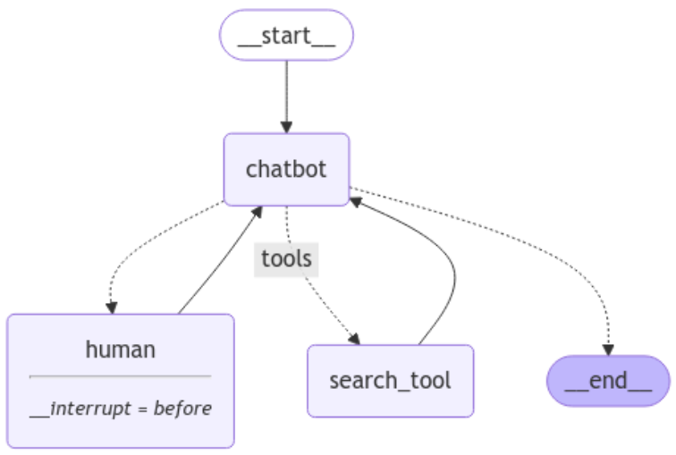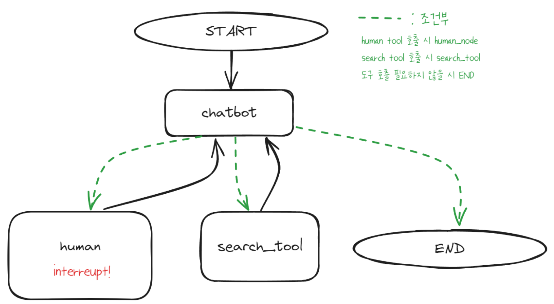 HumanAssistancetool을 호출 →ask_human=True,human노드로 이동searchtool을 호출 →ask_human=False,search_tool로 이동- tool 호출 없이 LLM이 답변