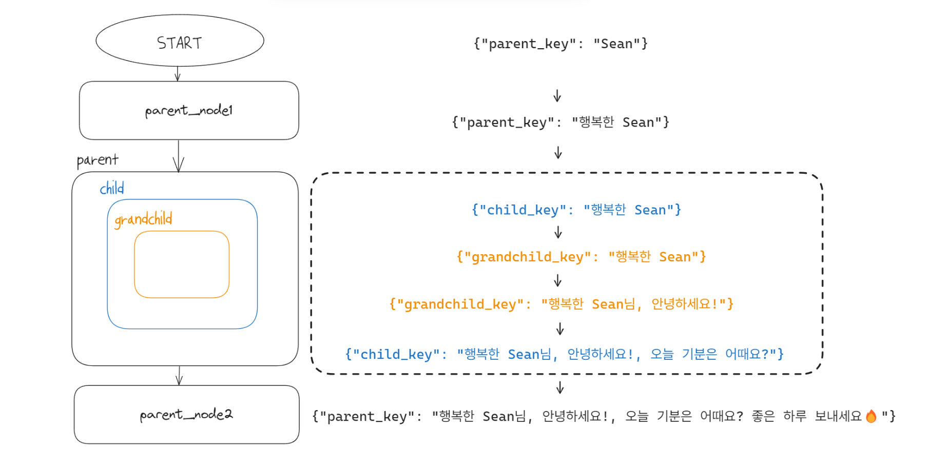 즉, 여기서 parent graph는 subgraph에 전달되는 name key를 전처리하고 subgraph를 호출하는 역할을 한다.