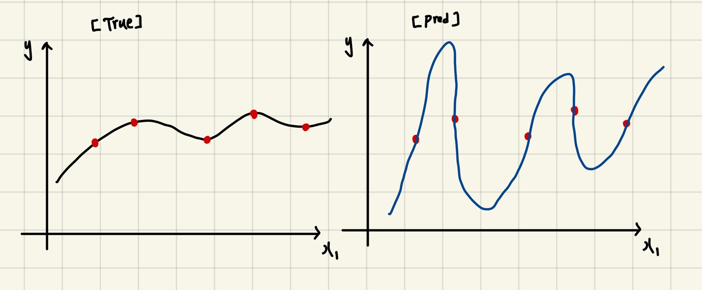 앞서 설명한 Overfitting은 Empirical Risk가 True Risk를 잘 대변하지 못할 때 발생한다. 아래의 그림은 그 예시를 보여준다. 즉, 왼쪽의 그림이 True 분포일 때, 오른쪽 그림은 예측값의 분포를 나타낸다. 만약 다른 True sample이 들어오면, 예측이 안좋을 것이라 예상할 수 있다. 즉, 이 경우 Empirical Risk는 낮지만, True Risk는 매우 큰 현상이 발생한다.