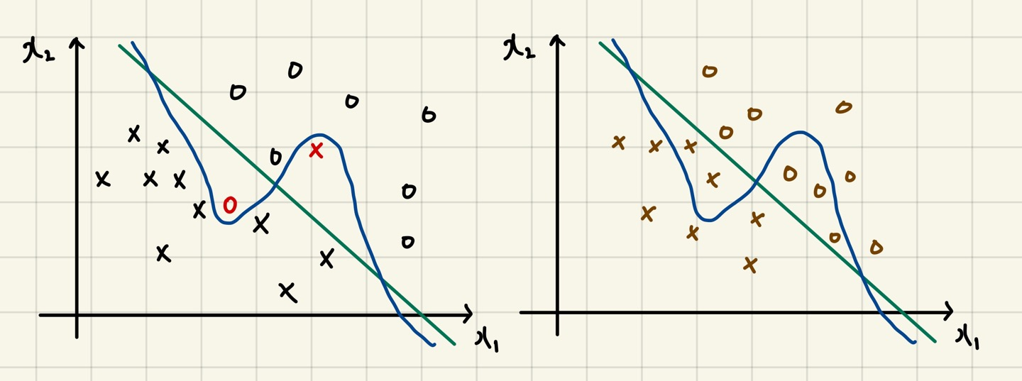 왼쪽 그림은 Train set이라고 할 때, 빨간색으로 표현한 일종의 outlier에 해당하는 sample point가 존재한다고 하자. Model capacity가 높아질수록 Decision boundary(결정 경계)는 초록색 직선에서 파란색 선으로 변한다. Train set에 대해서는 복잡한 파란선이 샘플을 완벽하게 분류하고 있다.