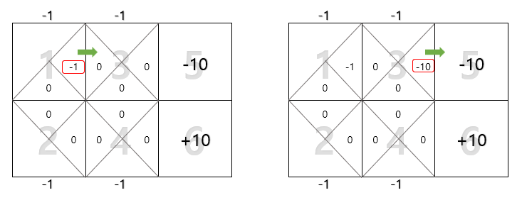 각 그리드별로 2개 혹은 3개의 의사결정을 내릴 수 있으며, state $s_t$는 로봇의 현재 위치(1,2,3,4,5,6)를 나타낸다. 또한, action $a_t$는 화살표로 나타내며, 그리드 내 삼각형 안의 숫자는 $Q(s,a)$를 나타낸다. 그리고 1,2,3,4번 그리드의 보상은 -1, 5번은 -10, 6번은 +10이다.