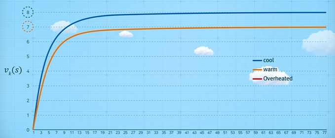 위 그래프에서 x축은 반복 횟수, y축은 가치함수의 값이다. 상태가 Cool일때 $v(C)$는 8로 수렴, 상태가 Warm일때 $v(W)$는 7로 수렴하고 있다. Cool상태에서 최적 정책을 통해 얻을 수 있는 누적보상합 기대치의 최대값이 8이고, Warm 상태에서 최적 정책을 통해 얻을 수 있는 누적보상합 기대치의 최대값이 7이라고 이해할 수 있다.
