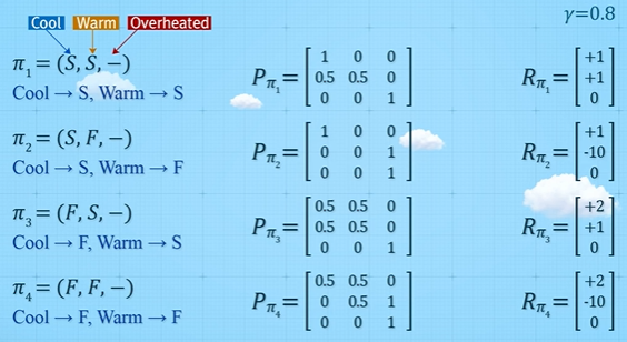 그런데, 사실 이 예시의 경우 상태가 총 3개, 행동도 2개뿐으로 모든 정책을 나열해볼 수 있다. 즉, 가능한 정책은 총 4개만 가능한 경우이므로, 아래와 같이 정책과 그에 따른 상태전이행렬과 보상행렬을 정의하고 정책 평가를 통해 가장 최상의 정책을 선택하면 된다.
