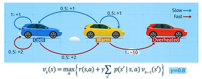 상태는 $s \in \{Cool, Warm, Overheated\}$, 각 상태에 대한 행동은 $a \in \{Slow, Fast\}$로 주어진 위의 예시를 다시 한 번 살펴보자.
